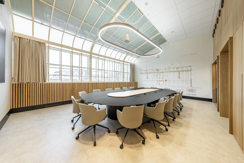 Novou zasedací místnost navrhlo studio JKH Architects s cílem vytvořit reprezentativní a funkční prostředí pro jednání až osmnácti osob. Dominantou prostoru je oválný stůl, kolem něhož bylo potřeba zvolit sezení splňující vysoké nároky na ergonomii, komfort i dlouhodobou odolnost.