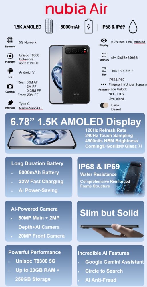 Značka nubia hlásí nový přírůstek do rodiny. Na trh míří smartphone nubia Air – skvělý smartphone, který přináší velkokapacitní baterii 5 000 mAh, 6,78″ 1.5K AMOLED displej a odolnost na úrovni vlajkových lodí s certifikací IP68 & IP69 proti vodě a prachu v ohromujícím, ultratenkém a lehkém designu.